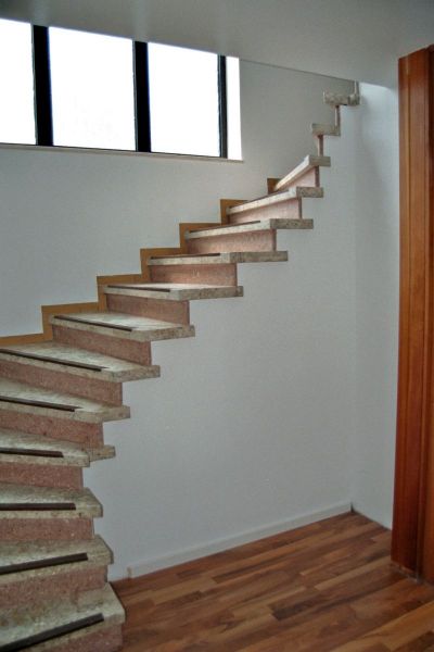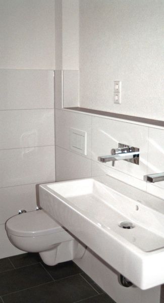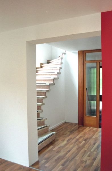 Im Erdgeschoss wurden durch zwei Durchbrüche durch die tragende Mittelwand attraktive Verbindungen der Nutzungsbereiche Essen und Kochen sowie Wohnen und Diele geschaffen und dadurch ein modernes Raumkonzept ermöglicht. Alle Sanitärräume wurden mit modernen Objekten neu gestaltet, die gesamte Haustechnik wurde komplett erneuert. Um dem täglich anfallenden Wäschebedarf eines 5-Personen-Haushalts logistisch gerecht zu werden, wurde auf Bauherrenwunsch ein Wäscheabwurf-System als Schachtanlage integriert. Dieses endet im Keller und sammelt dort die oben eingeworfene Wäsche zentral im Wäschekorb direkt neben der Waschmaschine.