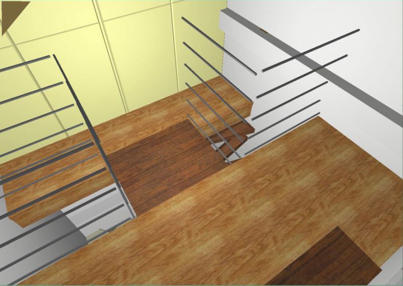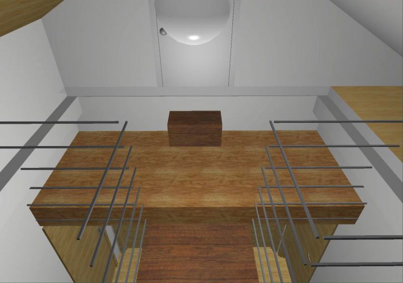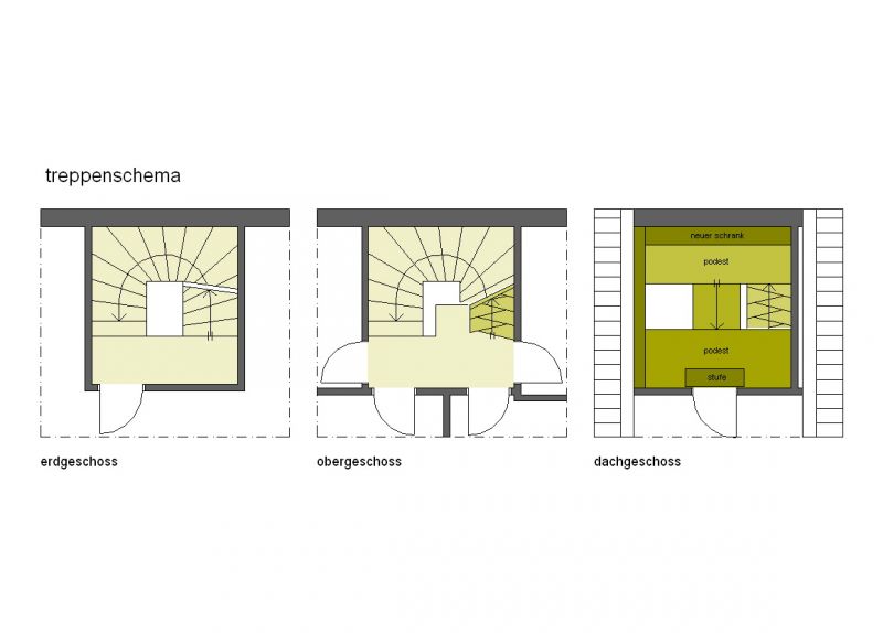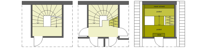 Über der ins Obergeschoss führenden Treppe wird ein Podest eingezogen, welches über eine Raumspartreppe vom Obergeschoss zu erreichen ist. Auf diesem Podest wird ein grosser Einbauschrank eingepasst, der als Archiv dienen soll. Über eine Brückenstufe gelangt man dann auf das zweite Podest, welches den Speicher erschliesst.